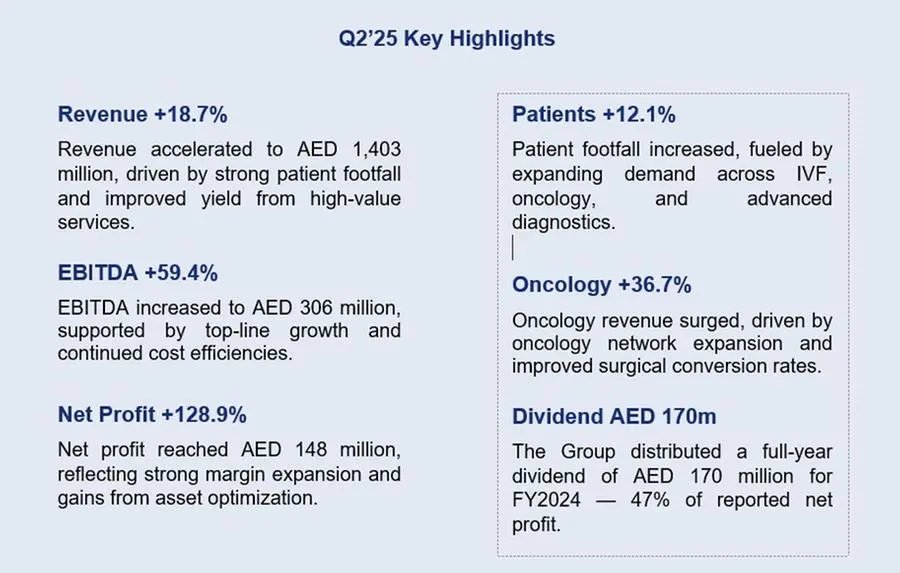 “We also advanced key strategic priorities, reinforcing leadership in complex care across oncology, transplants, fertility, mental health, and diagnostics. Our oncology platform is now the UAE’s largest private network, featuring new cancer clinics and cell and gene therapy capabilities. The Alkalma mental health platform is scaling regionally, alongside rehabilitation services through over 30 PhysioTherabia centers in Saudi Arabia. Additionally, we introduced the region’s first Osseointegration Clinic for cutting-edge prosthetic care.