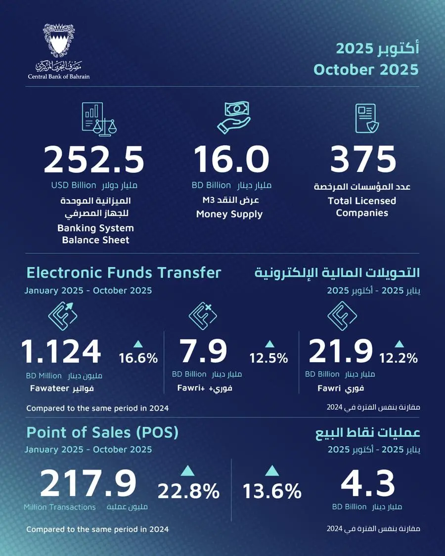 The Board also reviewed key monetary and banking indicators for the period up to October 2025 including the money supply, which decreased by BD 0.5 billion to reach BD 16.0 billion at the end of October 2025, compared to the same period in 2024. As for retail banks, total private deposits increased to reach BD 13.6 billion at the end of October 2025, an increase of 0.8% compared to the end of October 2024. The outstanding balance of total loans and credit facilities extended to resident economic sectors increased to BD 12.8 billion at the end of October 2025, an increase of 6.0% compared October 2024, with the Business Sector accounting for 40.6% and the Personal Sector at 48.2% of total loans and credit facilities. The balance sheet of the banking system (retail banks and wholesale sector banks) increased to $252.5 billion at the end of October 2025, an increase of 1.8% compared to the end October of 2024.