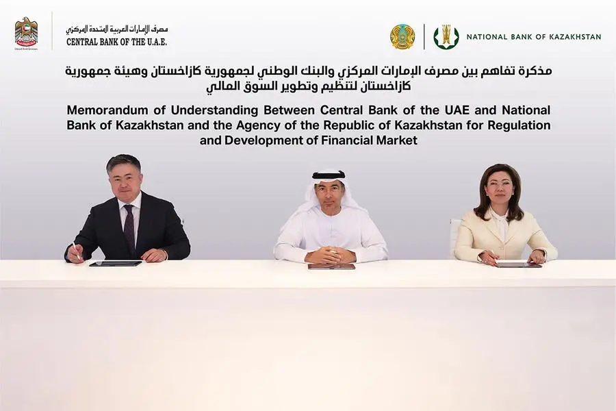Abu Dhabi: His Excellency Khaled Mohamed Balama, Governor of the Central Bank of the UAE (CBUAE), His Excellency Timur Suleimenov, Governor of the National Bank of Kazakhstan, and Her Excellency Madina Abylkassymova, Chair of The Agency of the Republic of Kazakhstan for Regulation and Development of Financial Market, signed a Memorandum of Understanding (MoU) aimed at strengthening cooperation and information exchange in areas of mutual interest.