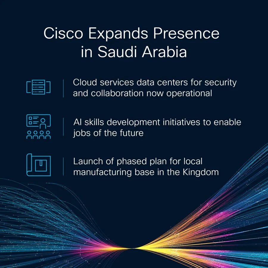 - Cisco is deepening its commitment in Saudi Arabia by establishing cloud services data centres, promoting AI talent development, and launching a phased plan for a local manufacturing base.
