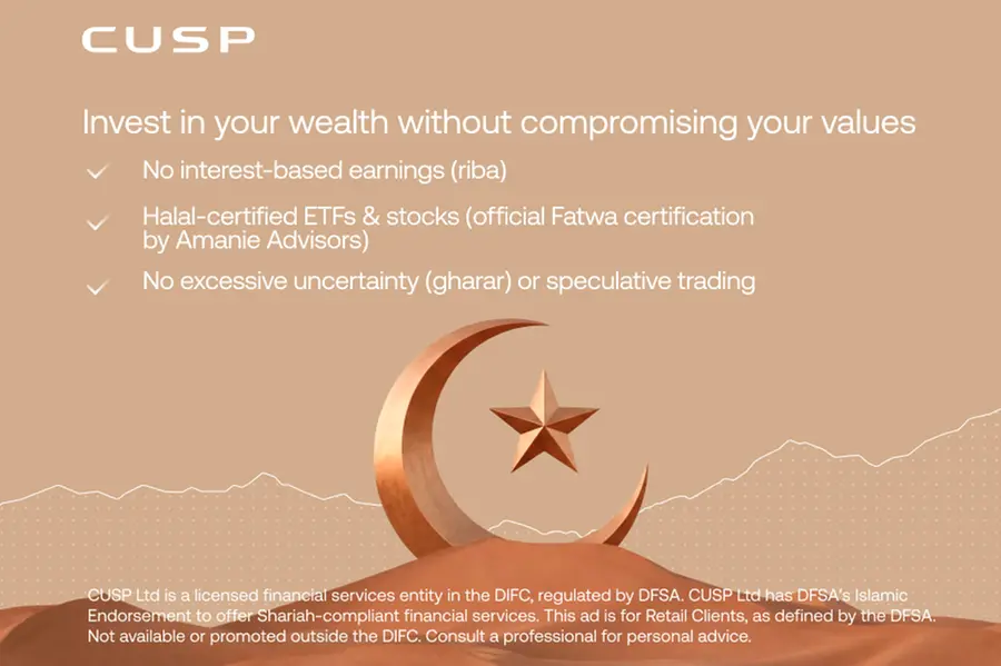 Cusp Wealth Ltd is registered in DIFC and regulated by the Dubai Financial Services Authority. Fees may be subject to change. Investment involves risk, including the potential loss of capital, and Shariah compliance does not eliminate investment risk. Past performance is not indicative of future results. Shariah compliance certification does not constitute investment advice or guarantee returns. For DIFC-based DFSA Retail clients only.
