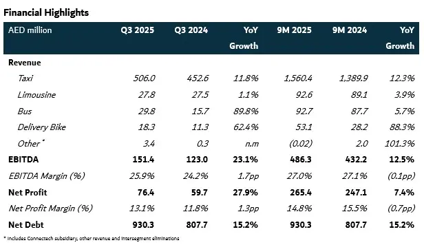 DTC’s CEO, Mansoor Rahma Alfalasi, added: “Our third-quarter performance builds on the strong momentum established in the first half of 2025, reflecting our disciplined execution and continued operational excellence. We delivered strong results across all key metrics, with robust revenue growth and profitability supported by sustained demand in our taxi, limousine, and delivery segments, underpinned by Dubai’s expanding tourism and population base. A key highlight this quarter was the launch of our strategic partnership with Kabi, marking a major milestone in advancing Dubai’s e-hailing ecosystem. By uniting two of the city’s leading mobility players, we are driving innovation, efficiency, and sustainability in line with Dubai’s vision to transition 80% of taxi trips to e-hailing. As we continue to execute our strategy, we remain focused on expanding smart, customer-centric mobility solutions and advancing our long-term sustainability agenda, reinforced by our commitment to a fully electric fleet by 2040.”