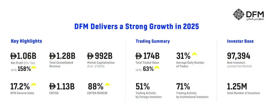 During 2025, the DFM General Index (DFMGI) rose by 17.2%, while total market capitalization reached AED 992 billion, highlighting the strength of market performance over the course of the year and reinforcing Dubai’s position as one of the region’s most dynamic and resilient capital markets.