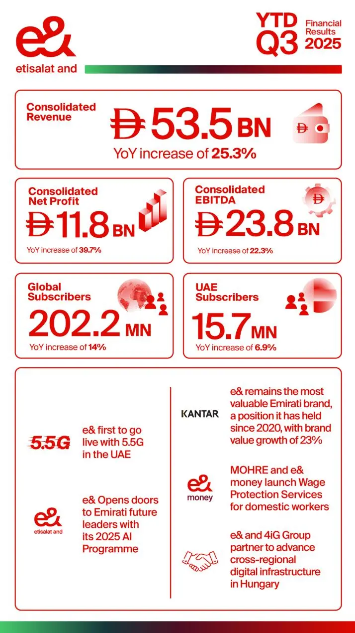 e& also reaffirmed its leadership in brand value as the Most Valuable Emirati Brand for 2025, valued at US$8.9 billion by Kantar BrandZ 2025.