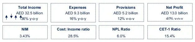 - Total income up 36% to AED 32.5 billion on our excellent deposit mix with higher interest rates feeding through to margins and strong growth across all business segment and products