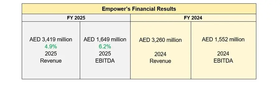 Empower's Revenues and Earnings Before Interest, Taxes, Depreciation, and Amortization (EBITDA) grew by 4.9% and 6.2%, respectively, in 2025 compared to the previous year. The company’s profit before tax increased by 10.5% to AED 1.103 billion, and net profit after tax increased by 10.5% to AED 1.004 billion for 2025.
