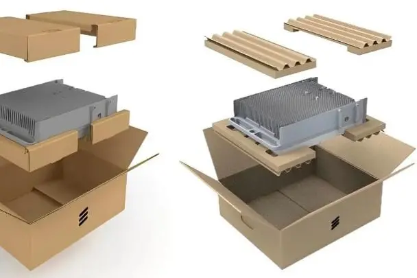 Designing *plastic-free packaging for heavy-duty electronic products (in this case typically weighing between 24-36kg) requires an innovative approach. Working with two suppliers, Nefab and DS Smith, Ericsson has developed two designs that incorporate the new materials while retaining the high structural integrity required to protect the product during shipping.
