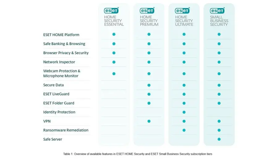 Table 1: Overview of available features in ESET HOME Security and ESET Small Business Security subscription tiers