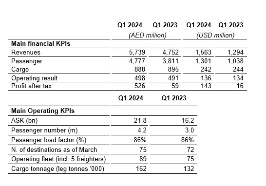Total revenue increased by AED 987 million (U.S.$ 269 million), from AED 4,752 million (U.S.$ 1,294 million) in Q1 2023 to AED 5,739 million (U.S.$ 1,563 million) in Q1 2024, reflecting an increase in network capacity and passenger numbers.
