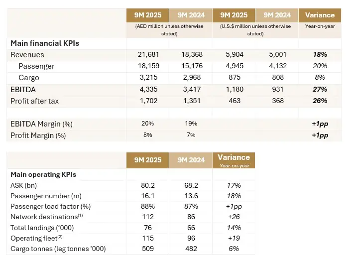 Profit after tax reached AED 1.7 billion (U.S.$ 463 million) for the first nine months of 2025, up 26 per cent compared to the same period last year, lifting the airline’s profit margin to 8 per cent, compared to 7 per cent for the same period last year.
