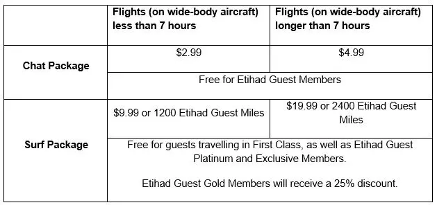Guests wishing to surf, catch up on social media and work while they fly, can also choose to purchase ‘Surf’ Wi-Fly plans available for a flat fee with unlimited data for the duration of the flight. For flights under 7 hours, the Chat package is $2.99 or free for Etihad Guest members, and the Surf package is $9.99. For flights over 7 hours, the Chat package is $4.99 or also free for Etihad Guest members, and the Surf package is $19.99.