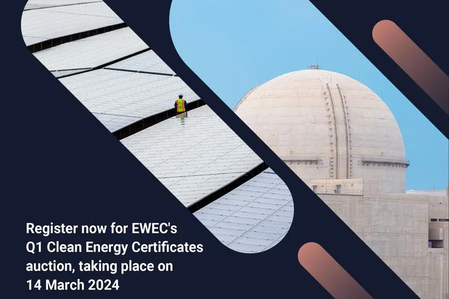 Abu Dhabi, UAE – EWEC (Emirates Water and Electricity Company), a leading company in the integrated coordination of planning, purchasing and supply of water and electricity across the UAE, today announced that registration is now open for its Q1 2024 auction for Clean Energy Certificates (CECs) in Abu Dhabi, with the auction scheduled to take place on 14 March 2024.