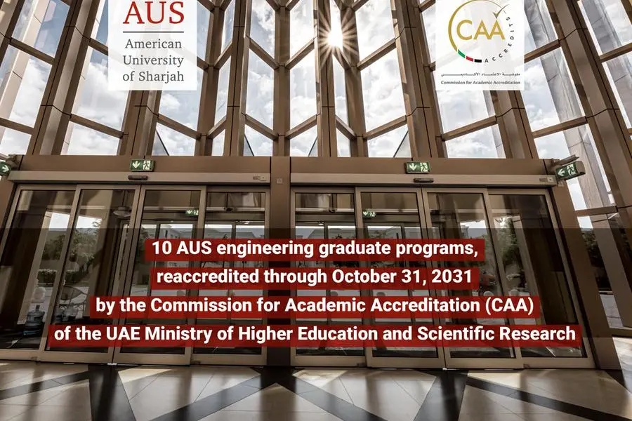 Sharjah, UAE – The College of Engineering (CEN) at American University of Sharjah (AUS) has received renewed accreditation from the Commission for Academic Accreditation (CAA) at the Ministry of Higher Education and Scientific Research (MOHESR) for 10 of its graduate programs through October 31, 2031.