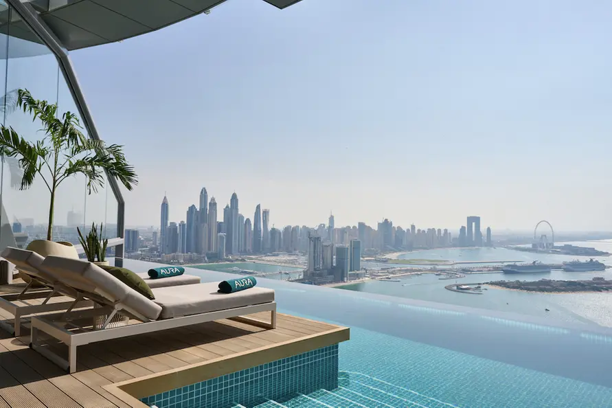 AURA is the world’s first and highest 360-degree sky pool lounge, with unparalleled views of Dubai. Brought to you by Sunset Hospitality Group, dedicated elevators transport guests to an island in the sky on the 50th floor of the Palm Tower that overlooks the majestic Dubai skyline.