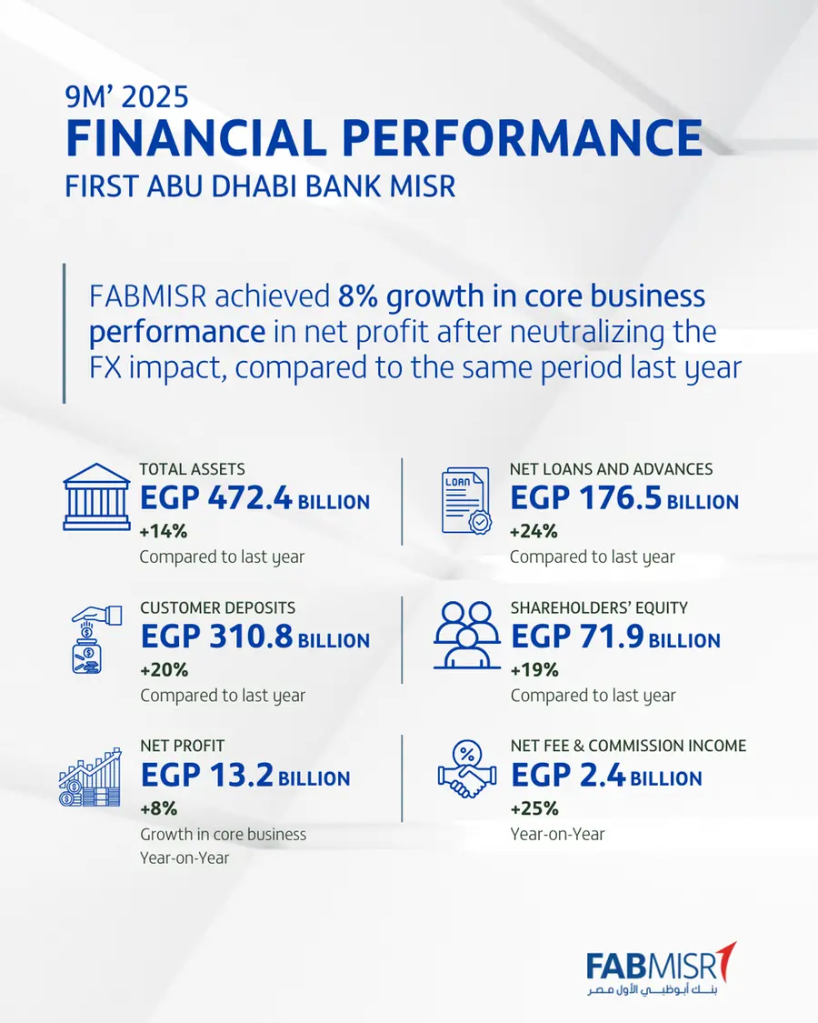 Cairo – First Abu Dhabi Bank Misr (FABMISR), one of the largest banks operating in Egypt, announced its financial results for the nine months of 2025, delivering strong performance in its core business operations. The bank recorded an 8% growth in net profit after neutralizing the FX impact, reaching EGP 13.2 billion compared to the same period last year, reflecting high operational efficiency and the successful execution of its strategy to drive sustainable value from core operations.