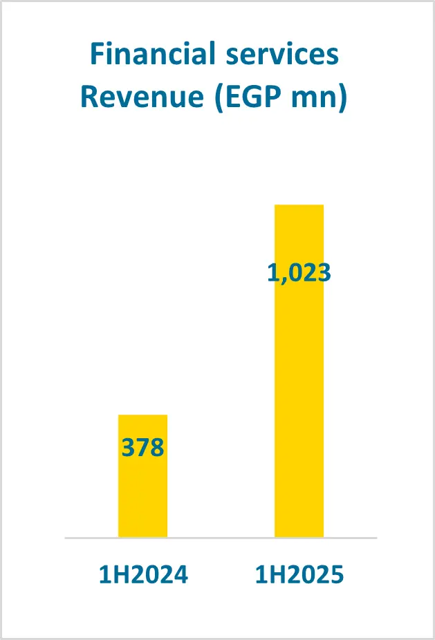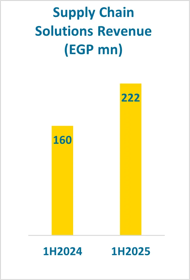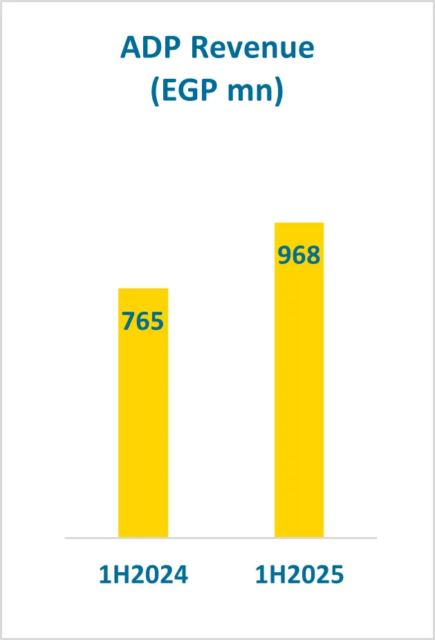 - Fawry’s revenue diversification strategy continued to gain strong momentum in 1H2025, with robust year-on-year growth across key business lines. Banking Services, now the Company’s largest revenue contributor, grew by 55.1%, accounting for 38.4% of total revenue for the period. Financial Services posted the highest growth rate, surging by 170.7% to represent 27.2% of total revenue. Meanwhile, ADP maintained solid performance with a 26.5% year-on-year increase, contributing 25.7% of total revenue—down from its position as the top revenue generator just two years ago, now ranking as the third-largest segment. Supply Chain Solutions advanced by 38.6%, making up 5.9% of total revenue, while Technology and Other segments grew by 67.5%, contributing 2.9%.