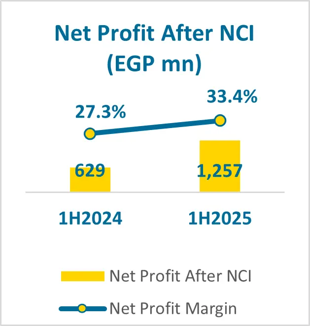 - Net profit grew by 99.9% year-on-year to EGP 1,257.0 million, supported by top-line expansion and improved EBITDA margins, underscoring the Company’s operational leverage.