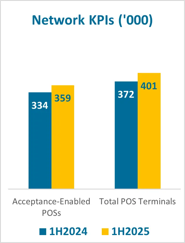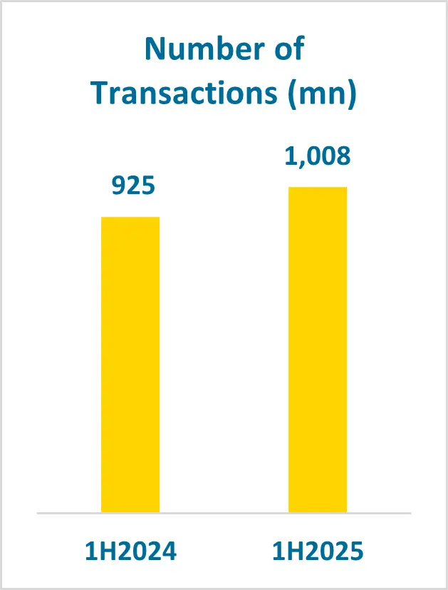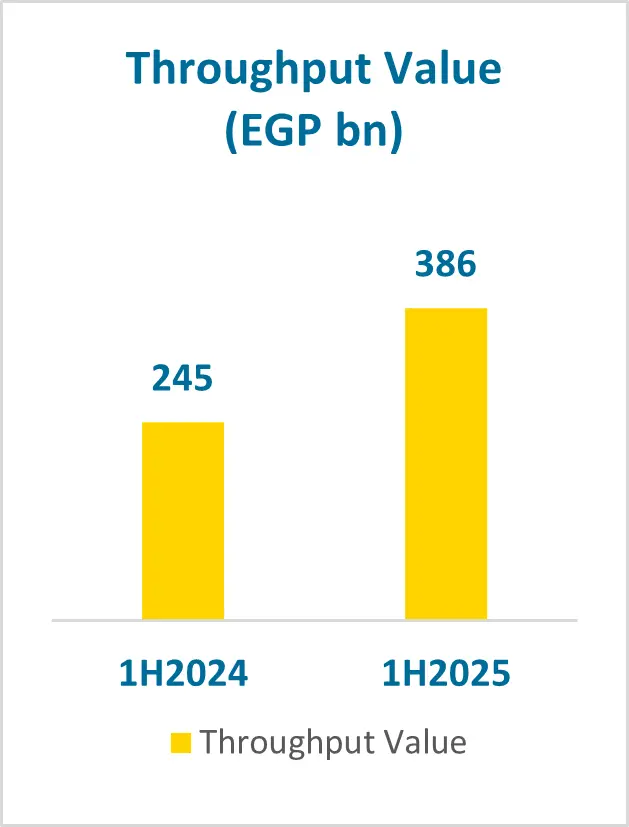 - Throughput value continued its strong upward trend, increasing by 57.6% year-on-year to reach EGP 385.9 billion in 1H2025. This growth was fueled by Fawry’s success in broadening its service portfolio to cater to a wide and diverse user base across Egypt.