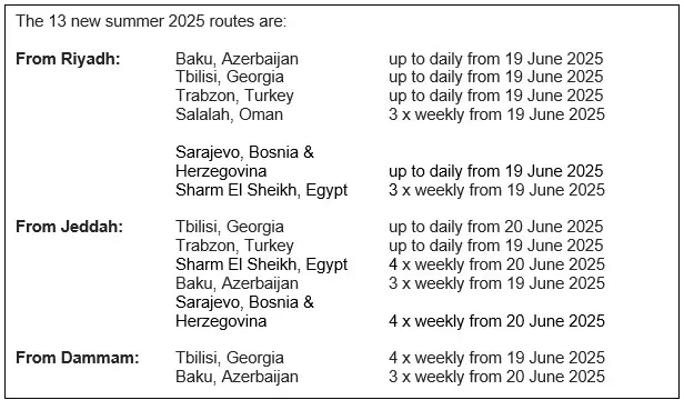 Saudi Arabia’s youngest and region’s fastest growing low-cost airline will operate a total of 13 routes across the six summer destinations from bases in Riyadh, Jeddah and Dammam over a 10-week period during the holiday season.