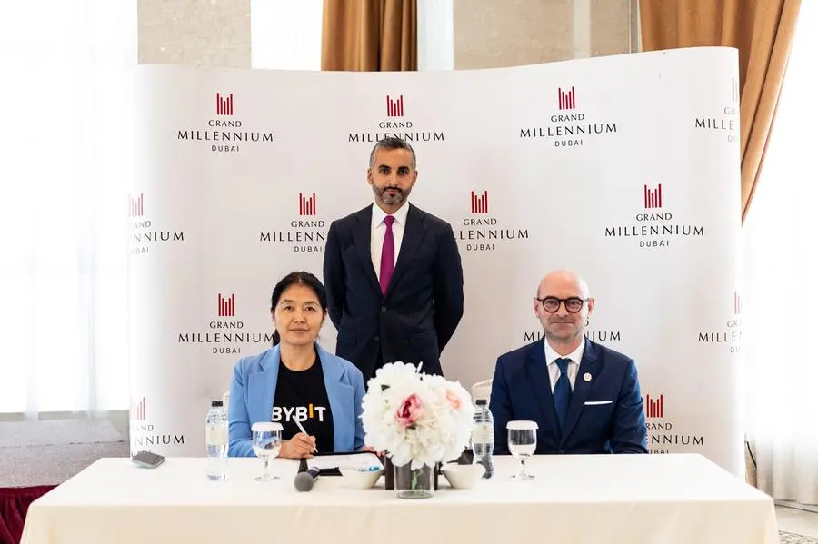 The official signing ceremony was attended by Helen Liu, COO & Partner of Bybit, Sheikh Almualla bin Ahmed Almualla & Feras Al Sadek of Ghaf Group, and Giacomo Puntel, General Manager of Grand Millennium Hotel Dubai.