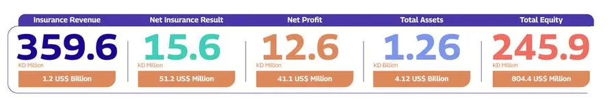 Insurance revenue reached KD 359.6 million (US$ 1.2 billion) compared to KD 449.2 million (US$ 1.5 billion) recorded for the same period last year.