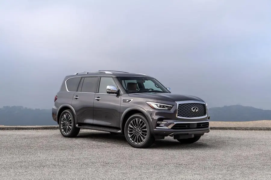 The 2023 INFINITI QX80 comes standard with the MYINFINITI mobile app, which enables owners to use their smartphones to monitor, control, and receive alerts from their vehicle. The SUV's graceful, athletic proportions, and exquisite detailing gives away its 5.6-liter V8 engine that generates an impressive 400 horsepower and 560 Nm of torque. The engine is shielded by a double arch grille with delicate folds that is inspired by origami and highlights the Japanese design essence.