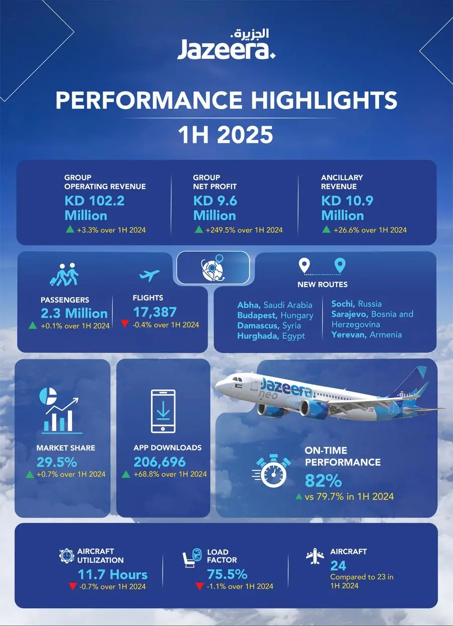 The airline posted a net profit of KD 9.6 million for 1H 2025, reflecting a remarkable 249.5% increase over the same period in 2024. Group operating revenue rose by 3.3% to KD 102.2 million, supported by capacity growth, a diversified portfolio business, and growing ancillary income.