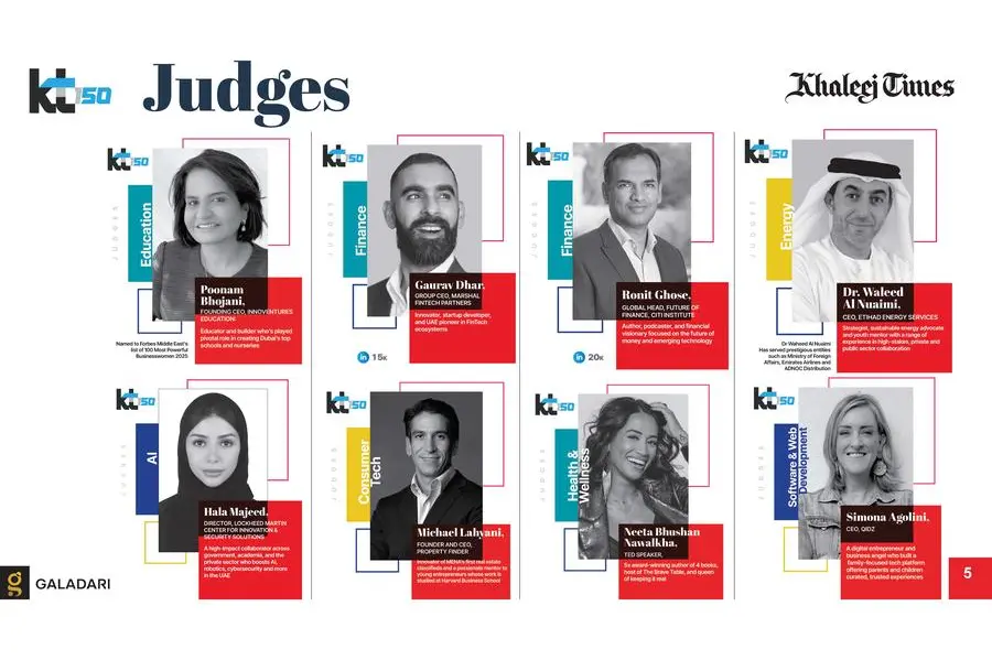 Dubai: From global entrepreneurs and viral influencers to tech disruptors and design icons, Khaleej Times has assembled an all-star judging panel for the inaugural KT+150 List – a first-of-its-kind initiative recognising the UAE’s next generation of Gen Z innovators. These 15 handpicked judges, each a leader in their field, will help identify the region’s most promising young voices shaping the future of industries like AI, fashion, esports, sustainability, and more.