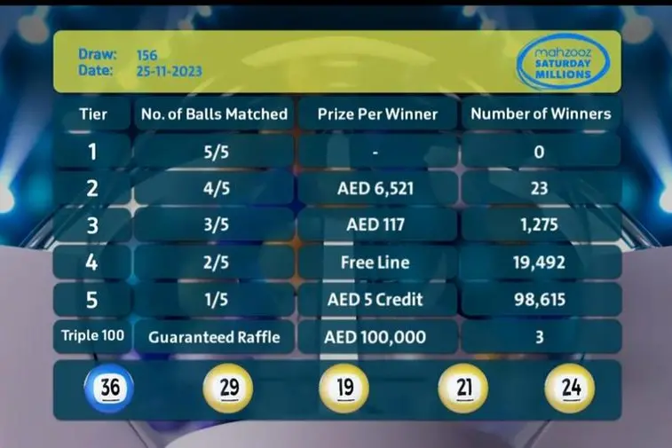 - As part of Mahzooz Saturday Millions’ newest prize structure, where 3 lucky participants win the Triple 100 GUARANTEED raffle prize of AED 300,000, the 156th draws awarded the holders of ID 40931783, ID 40768891, and ID 40972059 AED 100,000 each.
