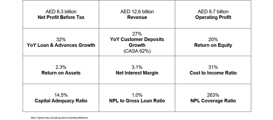 Operating income reached AED 12.6 billion, while net profit before tax totaled AED 8.3 billion, reflecting resilient performance and disciplined execution in a softer rate and higher-tax environment.