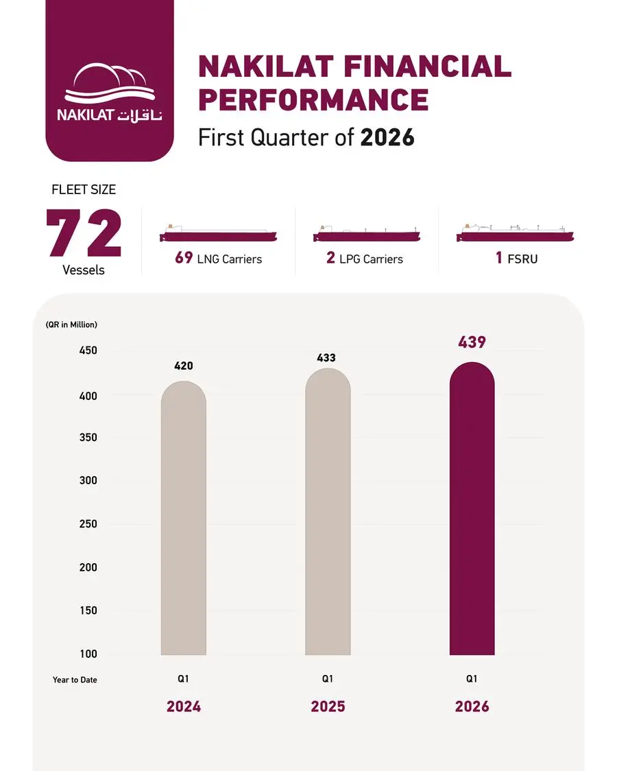 Doha, Qatar – Qatar Gas Transport Company Q.P.S.C. (Nakilat) announced its financial results for the first quarter ended 31 March 2026. The Company achieved a net profit of QAR 439 million compared to QAR 433 million for the same period of 2025.
