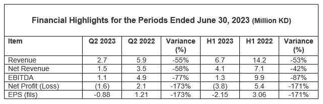 For Q2 2023, the Company reported a net loss of KD 1.6 million, or a loss per share of 0.88 fils, and an operating revenue of KD 2.7 million.