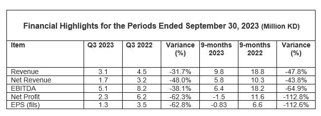 The Company’s operating revenue came in at KD 3.1 million, a decrease of 31.7% compared to the same period in 2022. Total assets stood at KD 572 million, as of September 30, 2023.