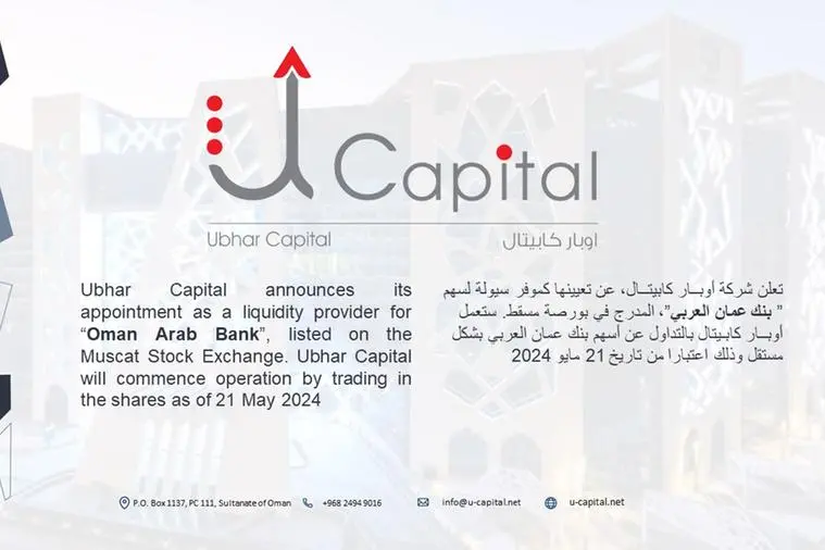 Ubhar Capital announces its appointment as a liquidity provider for “Oman Arab Bank”, listed on the Muscat Stock Exchange, after obtaining the necessary approvals from the regulatory authorities.
