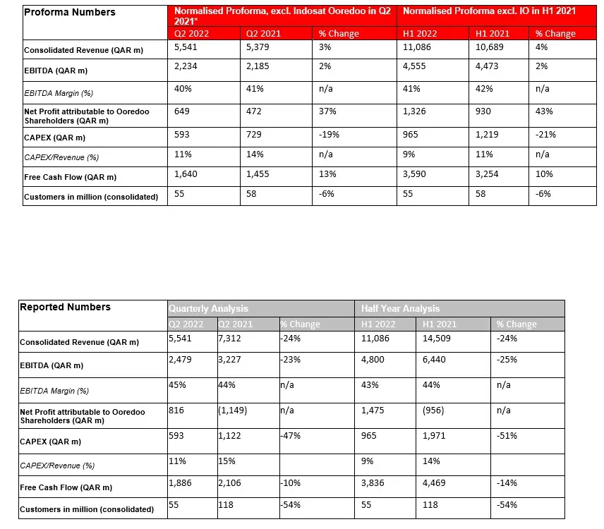 Due to the merger of Indosat Ooredoo (IO) and Hutchison in Indonesia as of January 4, 2022, the accounting treatment of Ooredoo’s previous largest international operation has been changed. Indosat Ooredoo Hutchison (“IOH”) Revenue, EBITDA, customers, and Capex are no longer consolidated, as the operation is now classified as a “joint venture company.” For “a like for like” comparison, we have added a proforma table excluding the Indonesian consolidated results in 2021 and normalising for major non-recurring items.