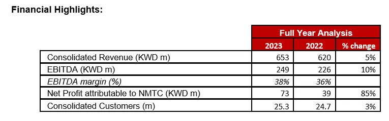 - Net profit attributable to NMTC increased to KWD 73 million in 2023 from KWD 39 million in 2022. The growth in Net Profit was mainly from Ooredoo Kuwait, after winning a final court ruling related to recovery of excess regulatory tariff paid amounted to KWD 43.8 million in a case against Kuwait’s Ministry of Communication “MOC” and Communications and Information Technology Regulatory Authority “CITRA”.