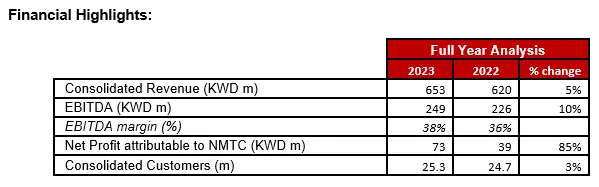 - Net profit attributable to NMTC increased to KWD 73 million in 2023 from KWD 39 million in 2022. The growth in Net Profit was mainly from Ooredoo Kuwait, after winning a final court ruling related to recovery of excess regulatory tariff paid amounted to KWD 43.8 million in a case against Kuwait’s Ministry of Communication “MOC” and Communications and Information Technology Regulatory Authority “CITRA”.