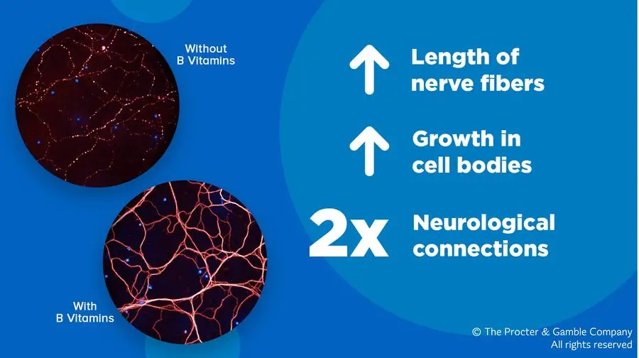 An in-vitro study initiated by P&G Health found that neuronal health, as defined by cell viability, neurite growth and the generation of a healthy neurite network significantly improves when nerve cells were grown under vitamins B1, B6, and B128.