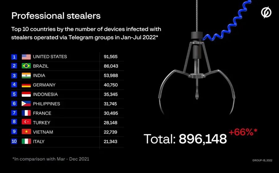 Dubai — Group-IB, one of the global leaders in cybersecurity, has identified 34 Russian-speaking groups that are distributing info-stealing malware under the stealer-as-a-service model. The cybercriminals use mainly Racoon and Redline stealers to obtain passwords for gaming accounts on Steam and Roblox, credentials for Amazon and PayPal, as well as users’ payment records and crypto wallet information. In the first seven months of 2022, the gangs collectively infected over 890,000 user devices and stole over 50 mln passwords. All the identified groups orchestrate their attacks through Russian-language Telegram groups, although they mainly target users in the United States, Brazil, India, Germany, and Indonesia. In 2022, info-stealing malware has grown into one of the most serious digital threats.
