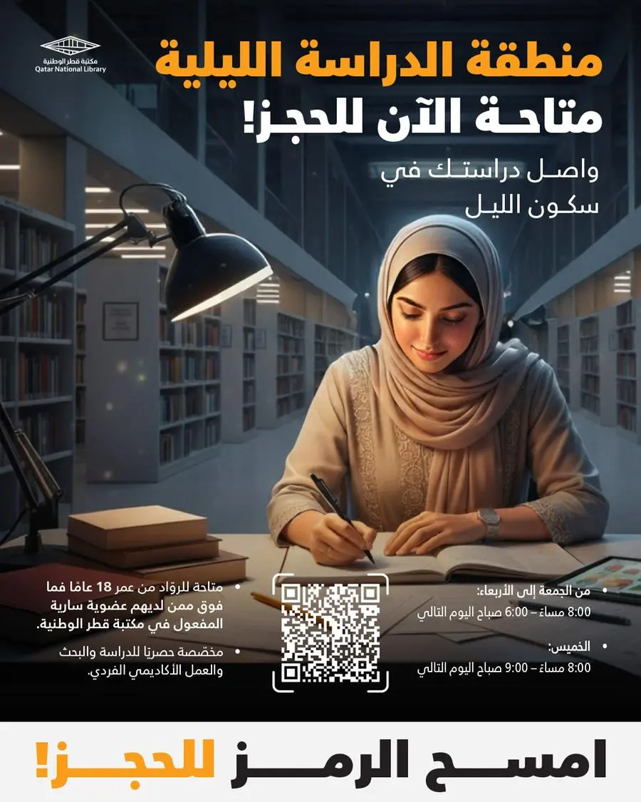 “By extending access to the study space after regular hours, we aim to offer our members the flexibility they need to study, research, and work in a peaceful setting that aligns with their schedules. This reflects Qatar National Library’s ongoing commitment to supporting learning and research within our community.”