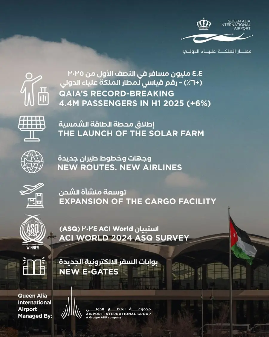 Reflecting on the accomplishments of the past six months, Airport International Group CEO, Nicolas Deviller, stated, “The first half of 2025 emphasizes the enduring strength of QAIA as a vital national asset and a cornerstone of Jordan’s air transport sector. In the face of regional adversity, we remained focused on growing our traffic and delivering impactful projects, innovative enhancements and passenger-centric services that uphold the highest international standards and shape QAIA into a welcoming airport that feels like home. With the steadfast support of our employees, partners and stakeholders, we are confident that the foundations laid during this period will drive success throughout the remainder of the year and beyond.”