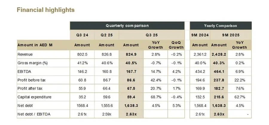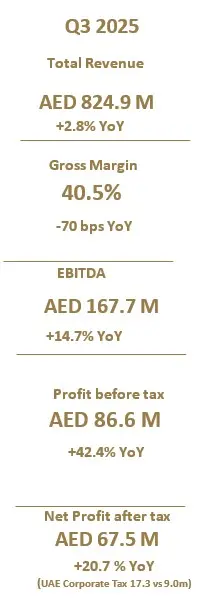 Our financial performance in Q3 has been strong, demonstrating the resilience of the business in the face of a tough macro-economic environment. Total revenue increased by 2.8% YoY to AED 824.9 million in Q3 and by 2.8% YoY to AED 2.43 billion in 9M 2025 as a result of continued strong demand from the UAE and Middle East.
