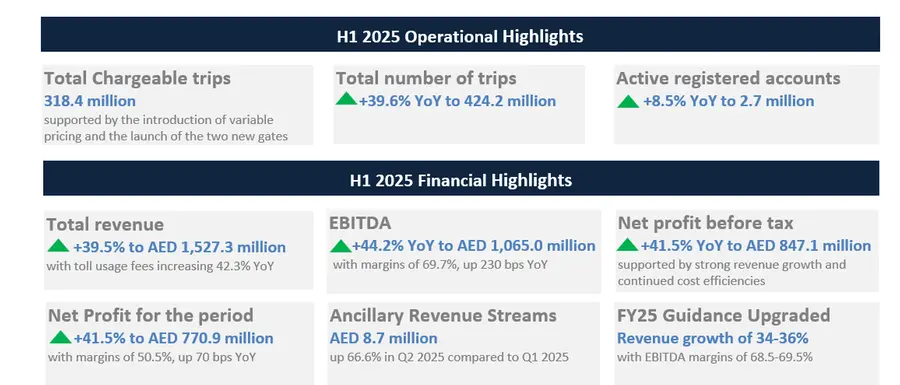 - Toll usage fees: performance was strong during the first half, increasing 42.3% YoY to AED 1,356.9 million, with toll usage fees growing 49.4% YoY to AED 691.3 million in Q2 2025. The increase in toll fees was primarily due to the first full quarter impact of the new variable pricing structure introduced at the end of January 2025, alongside the introduction of the two new gates.