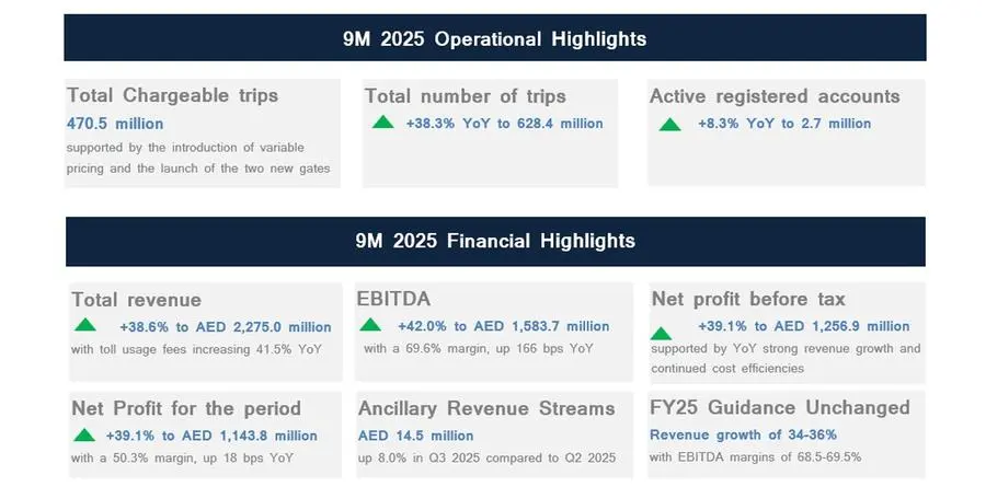 Salik Company PJSC (“Salik” or the “Company”), Dubai’s exclusive toll gate operator, today announced its financial results for the three-month and nine-month periods ended September 30, 2025 (“Q3 2025” and “9M 2025”). Total revenue for 9M 2025 increased 38.6% year-on-year (“YoY”) to AED 2,275.0 million, supported by a 36.9% YoY increase in Q3 2025. EBITDA grew 42.0% in 9M 2025 to AED 1,583.7 million, translating to a strong margin of 69.6%. Salik’s strong performance was driven by two new gates introduced in November 2024, the successful implementation of variable pricing at the end of January 2025 and a sustained positive macroeconomic backdrop. In Salik’s core tolling business, total chargeable trips reached 470.5 million in 9M 2025, of which 152.2 million were completed in Q3 2025.
