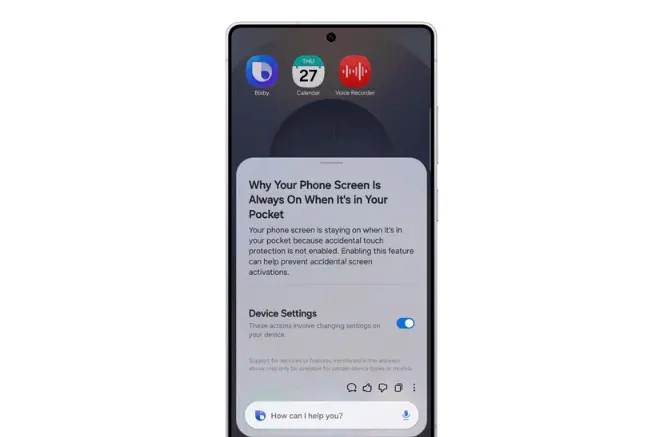 If a user asks, “Why is my phone screen always on when it’s inside my pocket?” Bixby will use the context of the situation and bring up relevant settings, such as Accidental Touch Protection, allowing them to turn it on directly.