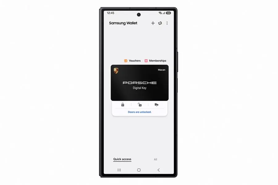 With Samsung Wallet, users gain intuitive and secure access to their Porsche vehicles through a single, unified interface. An easy swipe-up gesture and consolidated view of ID cards, payment methods, and keys allow Samsung Galaxy users to manage their essentials all in one place – without switching between multiple apps.