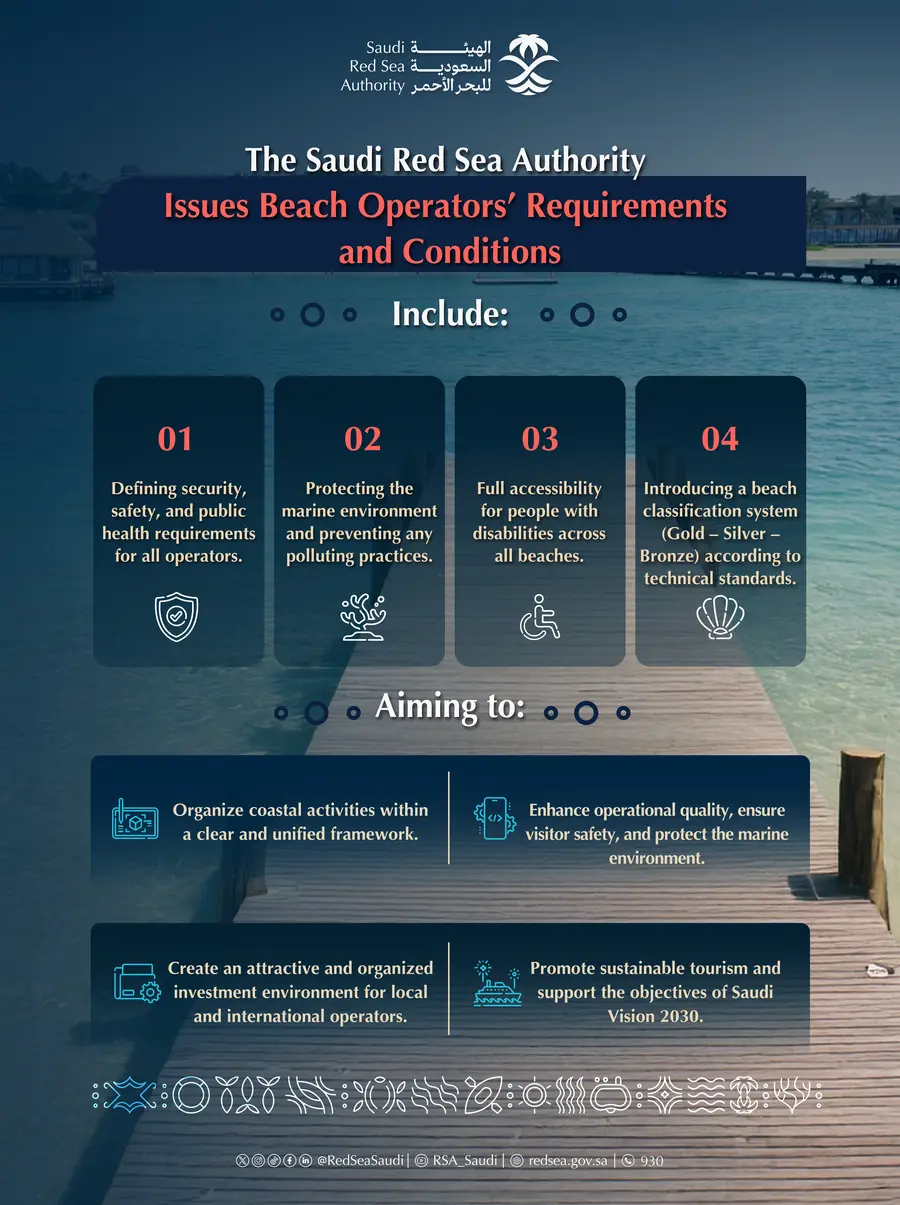 Saudi Red Sea Authority Issues Beach Operators’ Requirements and Conditions for the First Time in Saudi ArabiaFor the first time in the Kingdom, the Saudi Red Sea Authority (SRSA) has issued Beach Operators’ Requirements and Conditions, marking a qualitative step toward activating beaches as key economic enablers and supporting the development of sustainable coastal tourism along the western coast of Saudi Arabia.