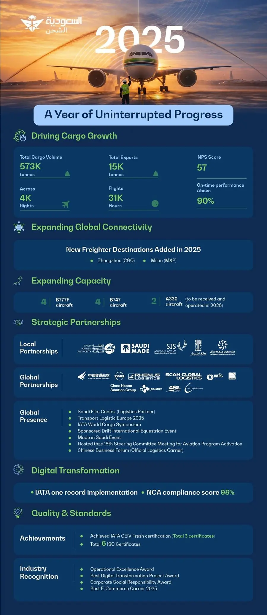 The year also witnessed a series of strategic partnerships that strengthened Saudia Cargo's local and international presence. These included agreements with the Saudi Tourism Authority and the Al-Ahsa Development Authority to support national development. Internationally, partnerships were formed with China Cargo Airlines and China's Henan Group to enhance connectivity between Asia and Europe via Zhengzhou and Riyadh.