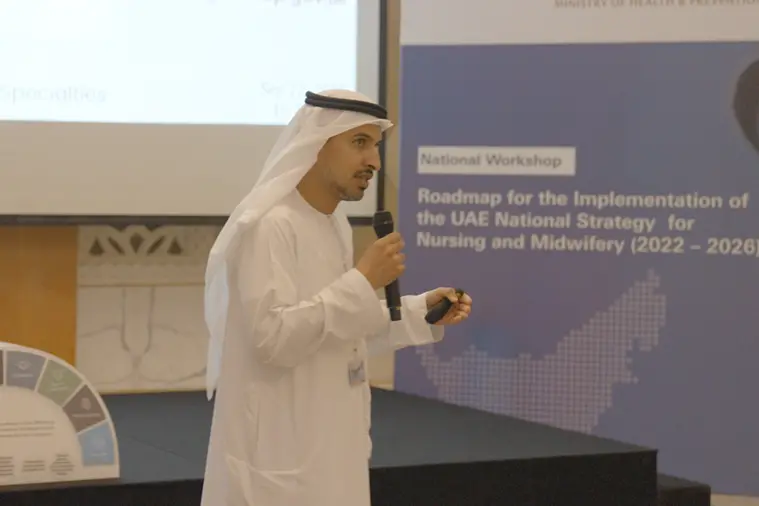 Abu Dhabi: Dr. Mohammed Al Houqani, Secretary General of the National Institute of Health Specialties, based at the United Arab Emirates University, participated in a workshop to roadmap the implementation of the National Strategy for Nursing and Midwifery 2022 – 2026. The workshop was organized by the National Committee for Nursing and Midwifery Affairs of the Ministry of Health and Prevention in Dubai and included national stakeholders from the regulatory, service, and academic sectors.