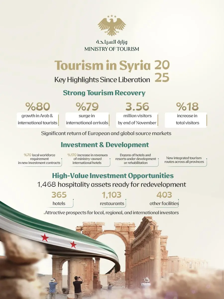Damascus, Syrian Arab Republic — The Ministry of Tourism today announced a significant resurgence in Syria’s tourism sector during the first year following the country’s liberation, signaling a structural shift toward sustainable, internationally integrated growth. H.E. Mazen Al Salhani, Minister of Tourism stated that arrivals of Arab and foreign tourists increased by 80% between January and November 2025 compared with the same period in 2024, while overall visitor numbers—including Syrians, Arabs, and foreigners—rose 18%, reaching 3.56 million.